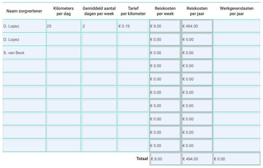 In deze tabel staan per zorgverlener de zorgkosten, reiskosten en werkgeverslasten. In het allerlaatste veld staat het totale zorgbudget.
